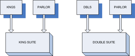 At the property level, OPERA allows you to configure the room types associated with Component Room room types. When you configure rooms (see Room Tab for details on room configuration) you may assign the physical room numbers of each room type to create the actual component rooms.